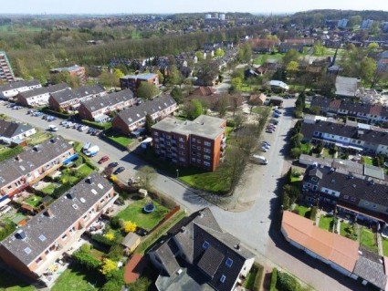 Ansicht auf das 16-Parteien-Wohnhaus mit Blick über Hahle.